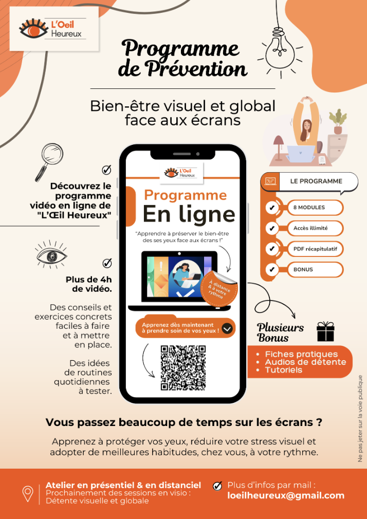 De cette expérience est né L’Œil Heureux, un projet qui allie prévention face aux écrans et au stress, et bien-être visuel, corporel et mental.